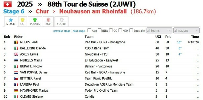 У п'ятницю, 20 червня, відбувся шостий етап шосейної велогонки Tour de Suisse. Перемогу здобув представник команди Red Bull-Bora-Hansgrohe Йорді Меус.