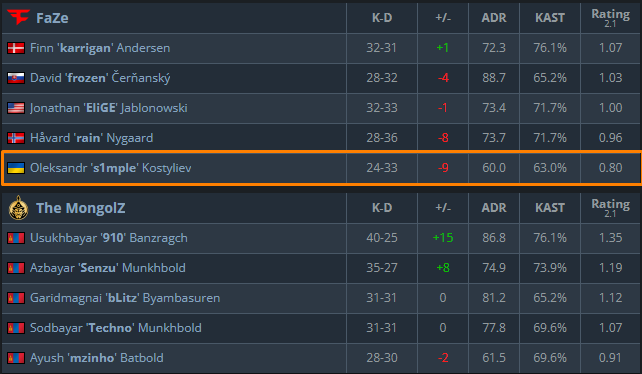 Олександр «s1mple» Костилєв провалив матч у чвертьфіналі проти The Mongolz. Він був найгіршим у складі FaZe Clan, його статистика за 2 карти – 24 вбивства і 33 смерті з рейтингом 0,80. Велику кількість снайперських і важливих дуелей він програв монголу 910.