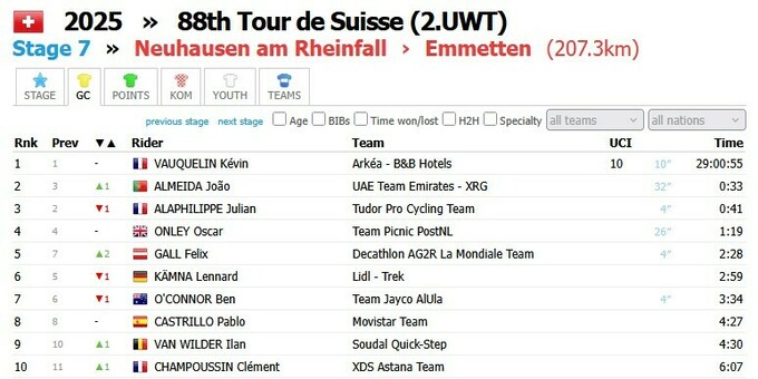 Лідером генеральної класифікації після сьомого етапу залишається Кевін Воклен. Другим з відставанням у 33 секунди йде Жоау Алмейда.