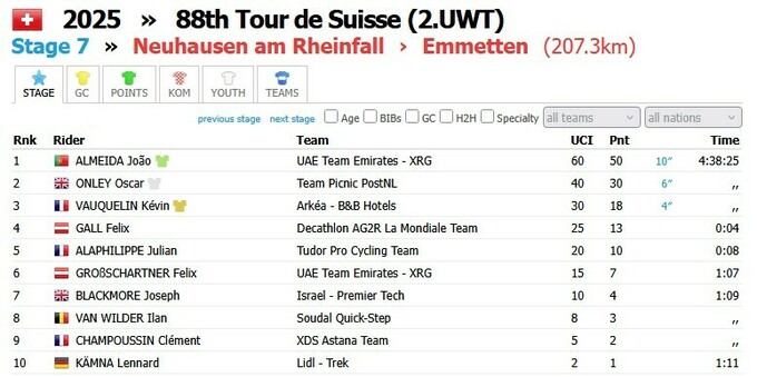 У суботу, 21 червня, пройшов сьомий етап шосейної велоперегони Tour de Suisse. Перемогу здобув представник команди UAE Team Emirates XRG Жоау Алмейда.
