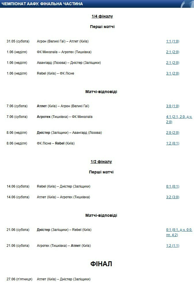 Дністер (Заліщики) – Ребел (Київ) – 0:1, пен. 4:2 (перший матч – 1:0).