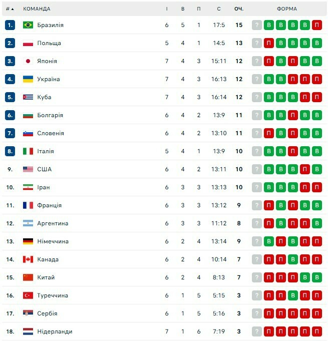 Ліга націй з волейболу (чоловіки). Турнірна таблиця (після матчів 27 червня)