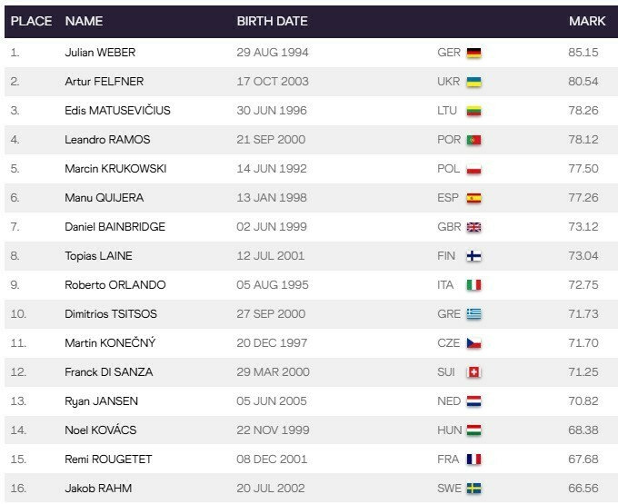 - 1. Юліан Вебер (Німеччина) – 85.15 м