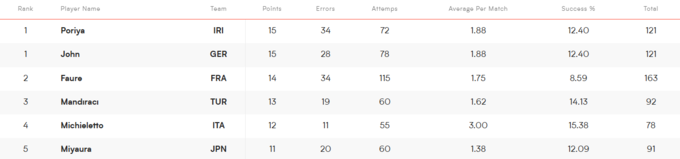 Впевнено себе проявив у захисті ліберо Олександр Бойко, який зробив 58 вдалих дій і став шостим за цим показником серед усіх гравців турніру.