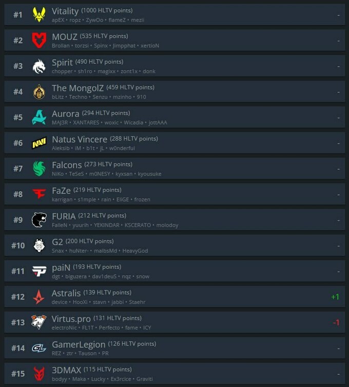На другому місці – MOUZ, які мають 535 очок, а третє місце з 490 балами посідає Spirit. Четверте місце займає The MongolZ із 459 очками – головна сенсація останніх років. Aurora посідає п’яту сходинку, випередивши NAVI. «Народжені перемагати» знаходяться на шостій позиції з 288 очками.