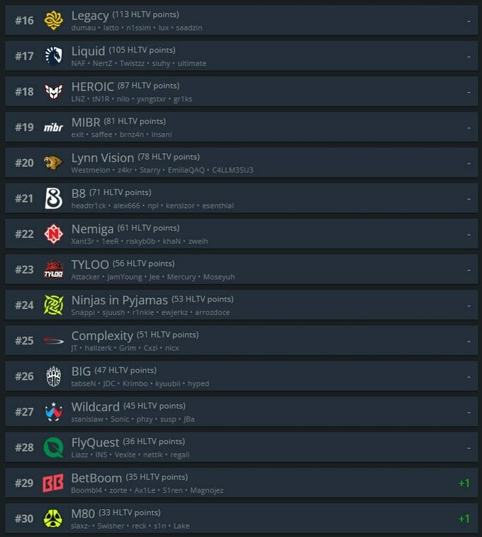 NAVI Junior, попри нещодавній гучний трансфер Makazze до основного складу, втратили дві позиції та опинилися на 43 місці. Команда FAVBET піднялася на одну позицію – зараз вони на 59 сходинці. Натомість Monte втратили одну позицію та наразі посідають 72 місце.