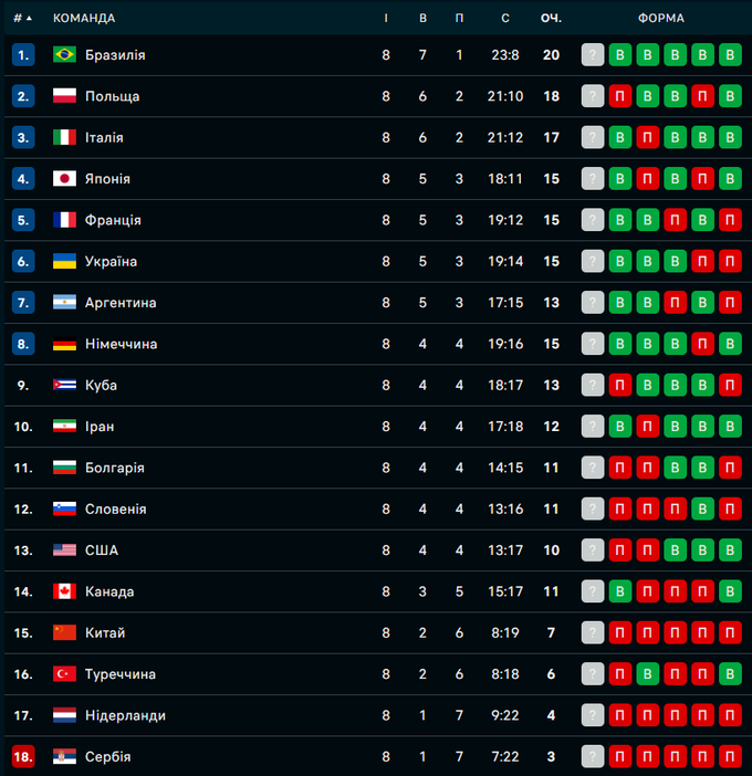 Другий тиждень волейбольної Ліги націй позаду. В це важко повірити, але національна команда України, яка є дебютанткою цих змагань, зберігає позитивний баланс виграних і програних матчів і тепер уже реально, а не в оптимістичних прогнозах претендує на потрапляння до Фіналу восьми. Точніше, для того, щоб зіграти у чвертьфіналі, треба посідати місце не нижче сьомого, адже команда-господарка вирішальної стадії – збірна Китаю – реальних шансів потрапити у вісімку не має. Радше навпаки – китайці були б, якби не не дуже об’єктивна система розіграшу, одними з головних претендентів на вибування. Замість того вони отримують ґарантовану перепустку в чвертьфінал і заброньоване місце в Лізі націй-2026.