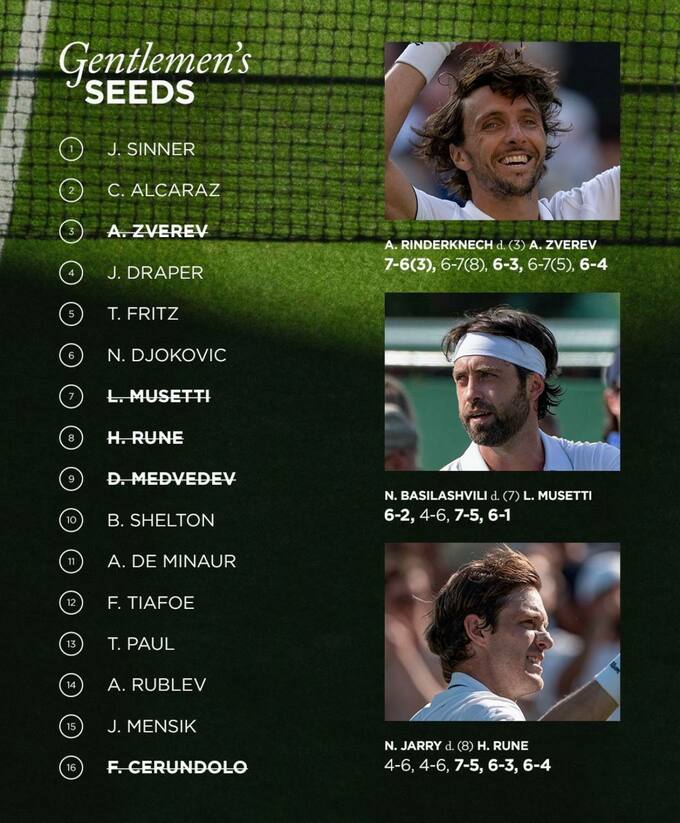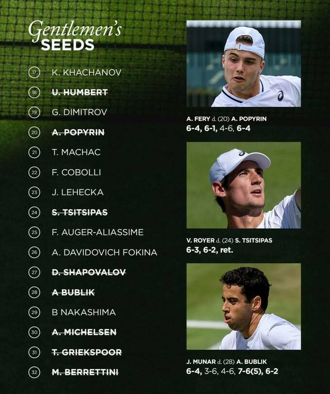 За підсумками першого кола Вімблдона у чоловіків вилетіли 13 сіяних гравців