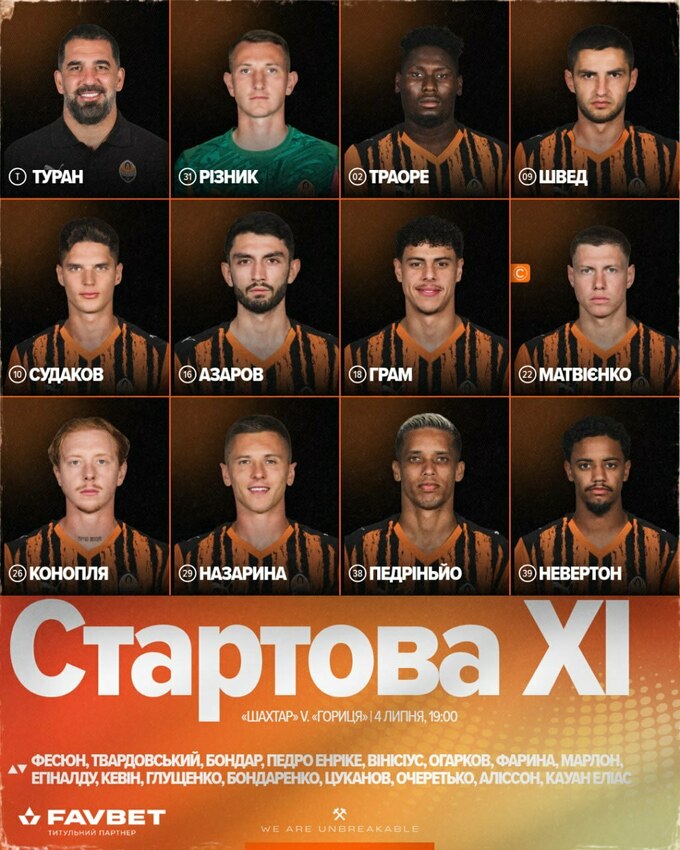 «Шахтар» (1 тайм): Різник – Азарові, Матвієнко, Грам, Конопля – Судаков, Назарина (Егіналду, 31), Педріньйо да Сілва – Швед, Траоре (Глущенко, 31), Невертон.