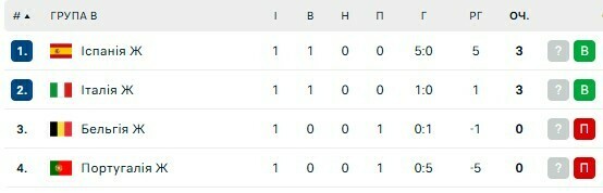 Після першого туру в групі B лідирують Іспанія та Італія (по 3), програли свої матчі Бельгія та Португалія (по 0).