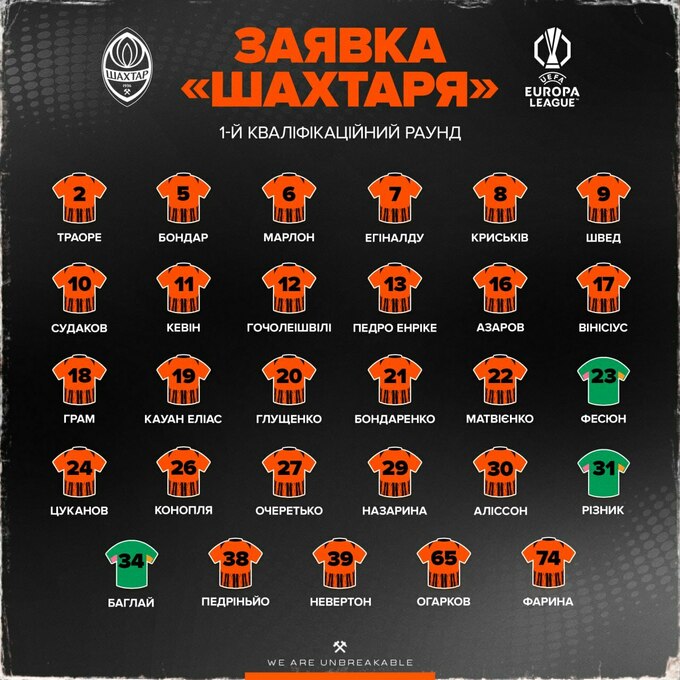 Донецький «Шахтар» опублікував список гравців, які візьмуть участь в іграх першого кваліфікаційного раунду Ліги Європи УЄФА 2025/26.