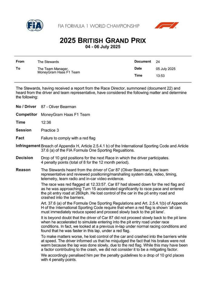 Олівер Беармен знову опинився в центрі уваги стюардів – цього разу через порушення правил під час червоного прапора на завершальному тренуванні Гран-прі Великої Британії. Пілот Хаас отримав штраф у 10 позицій на стартовій решітці, а також 4 штрафні бали, які підняли його загальну кількість до восьми за останні 12 місяців.