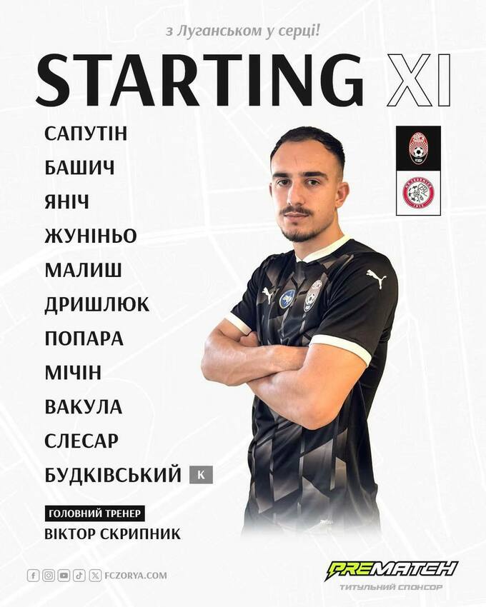 Зоря Луганськ: Сапутін, Башич, Яніч, Жуніньо, Малиш, Дришлюк, Попара, Мічін, Вакула, Слесар, Будківський