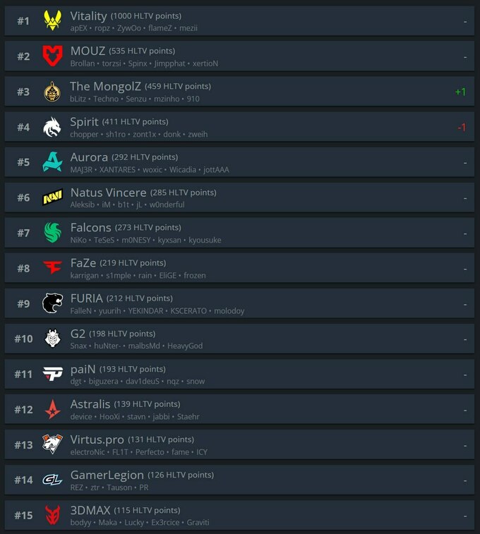 Команда Vitality зберігає перше місце з максимальною кількістю – 1000 рейтингових очок. На другому місці утримується MOUZ, які мають 535 балів.