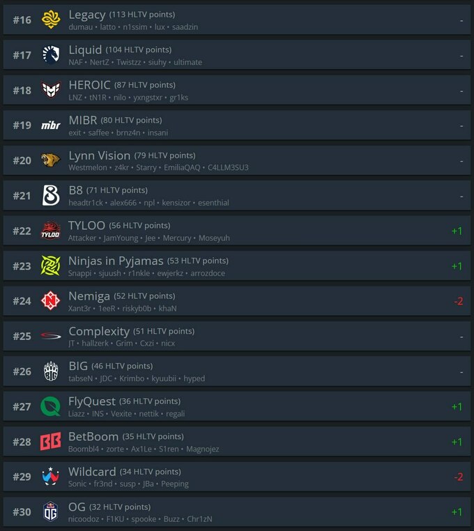 Falcons залишилися сьомими, маючи 273 очки. Склад команди із зірковими NiKo, m0NESY поки не зміг вийти вище у таблиці. FaZe перебувають на восьмому місці.