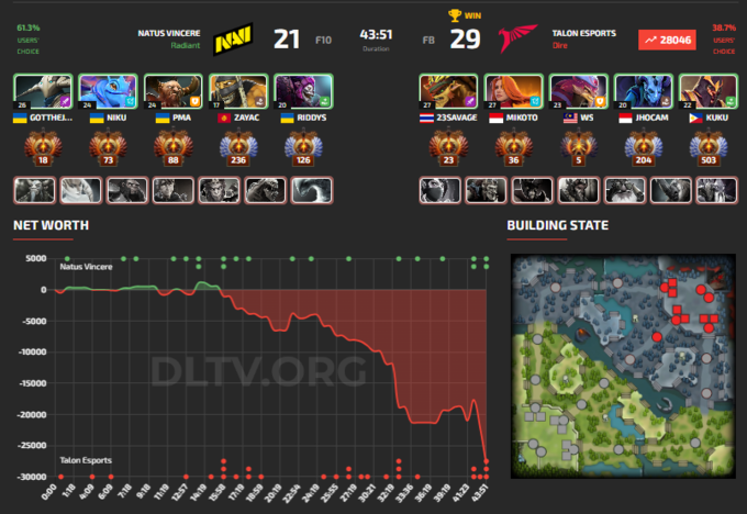 У першій карті Talon Esports добре почали, рання стадія гри була за ними. Однак коли NAVI зібралися разом, провели вдалу бійку навколо Рошана і вже повернулися по нетворсу. Карта була нервовою, байбек від Abaddon і NAVI просто пішли в трон, Talon Esports взагалі не змогли провести якісний захист.
