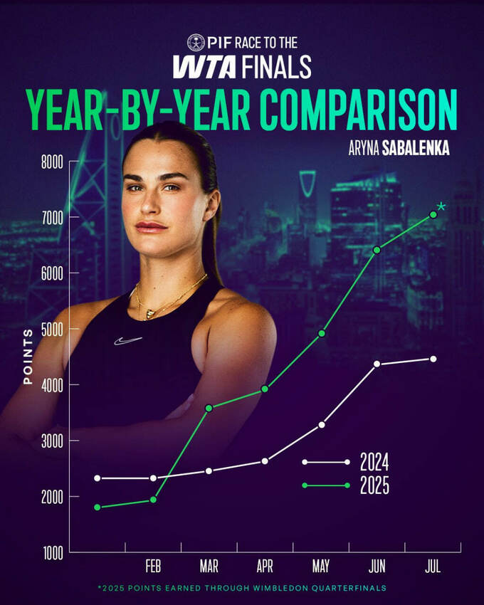 У жінок першою на WTA Finals вийшла перша ракетка світу Аріна Соболенко. У «нейтралки» – 7395 очок. Другою йде Коко Гофф зі США – 4609 балів.