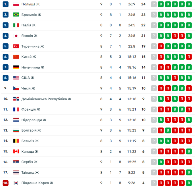 Зараз у сербок 1 перемога при 8 поразках і 8 очок. Нижче тепер лише Південна Корея – теж 1-8, але лише 4 очки та Таїланд, який ще не зіграв 9-й матч. Дебютанти VNL чешки, попри поразку, зберігають 9-те місце (4-5, 10 очок), лише на одну позицію нижче межі потрапляння до фінального етапу в Лодзі.