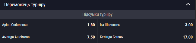 Перед стартом поєдинків букмекерські контори обрали головну претендентку на трофей. Нею є перша ракетка світу Соболенко, на чемпіонство якої можна поставити з коефіцієнтом 1.80.