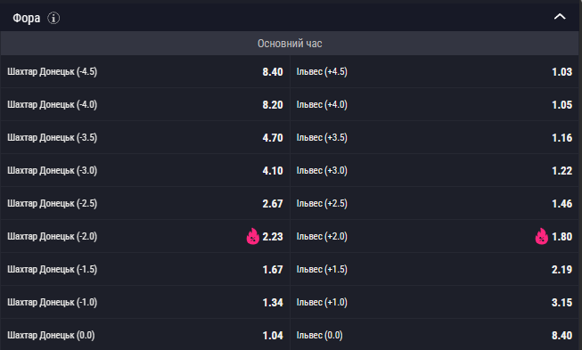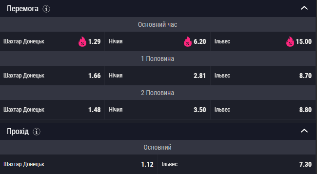 Основні коефіцієнти на матч Шахтар – Ільвес: