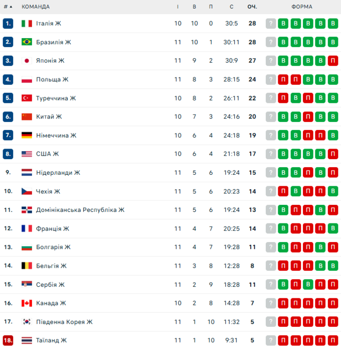 Для Японії це вже дев’ята перемога у турнірі (27 очок), і команда закріпилася в трійці лідерів. Польща, яка вже має гарантоване місце у фіналі як господарка вирішального етапу в Лодзі, поки залишається четвертою після другої поспіль поразки на турнірі, раніше вони поступились команді Бразилії.