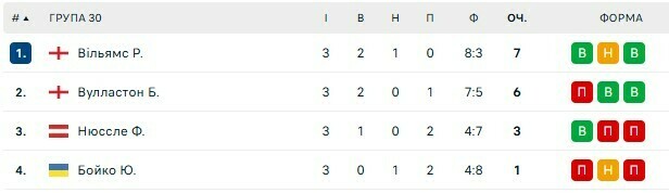Юліан Бойко спочатку поступився Бену Вулластону (1:3), потім зіграв унічию з Роббі Вільямсом (2:2) і програв Флоріану Нюссле (1:3).