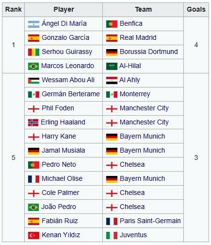 Четверо футболістів забили по 4 м’ячі: Гонсало Гарсія (Реал Мадрид), Анхель Ді Марія (Бенфіка), Маркос Леонардо (Аль-Хіляль) і Серу Гірассі (Боруссія Дортмунд).