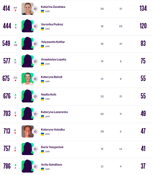 Великий прогрес у Олександри Олійникової завдяки трофею на 75-тисячнику в Гаазі – плюс 23 місця і 170-та сходинка (особистий рекорд). Анастасія Соболєва додала одну позицію – 233-тя.