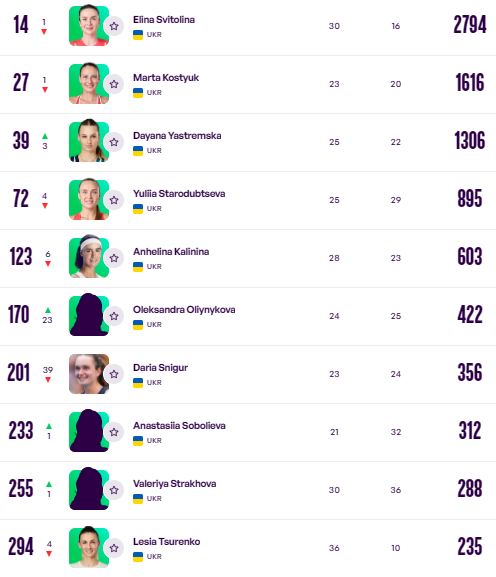 Втратили позиції і Юлія Стародубцева (мінус чотири – 72-га), Ангеліна Калініна (мінус шість – 123-тя), Дар'я Снігур (мінус 39 – 201-ша), Леся Цуренко (мінус чотири – 294-та).