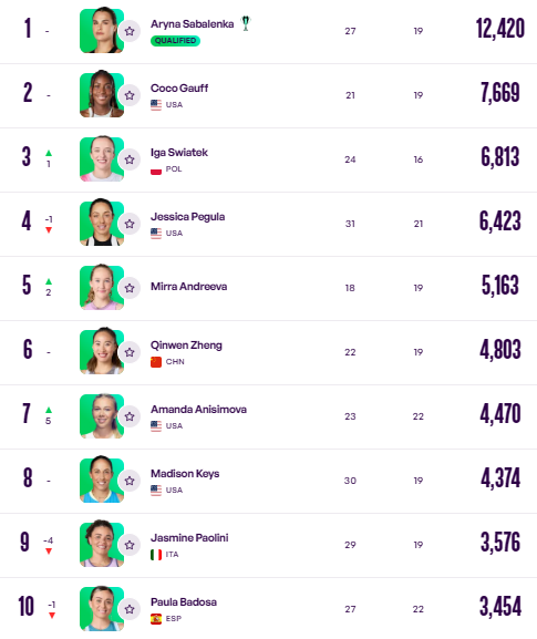Зі змін у топ-10: Мірра Андрєєва піднялася на п'яту сходинку, фіналістка Вімблдона Аманда Анісімова тепер сьома найкраща в світі, а Жасмін Паоліні (не зуміла захистити фінал британського слему) втратила аж чотири місця – вона дев'ята.