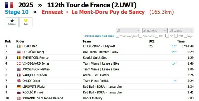 Після десятого етапу лідером загального заліку став Бен Хілі. Тадей Погачар відстає на 29 секунд.
