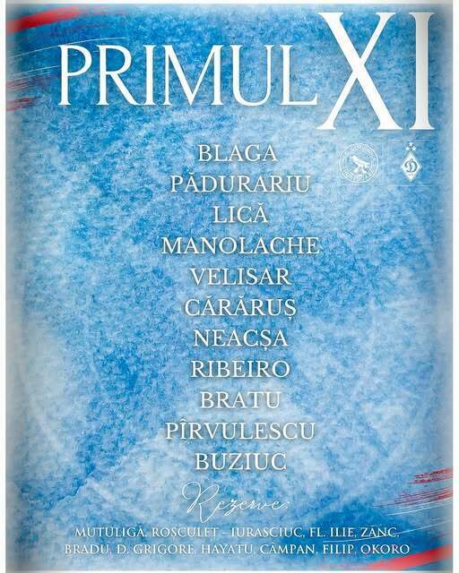 Запасні: Мутуліга, Рошкулець, Юрасчук, Флорін Іліє, Занк, Браду, Грігоре, Хаяту, Кампан, Філіп Іліє, Окоро.