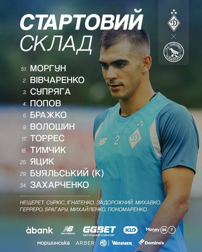 «Динамо» Київ: Моргун – Вівчаренко, Захарченко, Попов, Тимчик – Яцик, Бражко – Торрес (Брагару, 66), Буяльський, Волошин – Супряга (Герреро, 60).