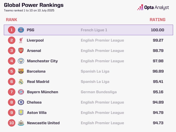 Статистичний портал Opta оприлюднив список найкращих клубів світу після фіналу клубного чемпіонату світу, в якому лондонський «Челсі» розгромив «ПСЖ» з рахунком 3:0.