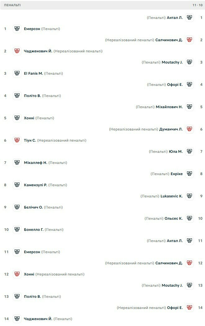 Серія пенальті: Антал (0:1), Емерсон (1:1), Салчинович (не забив), Чадженович (не забив), Муташі (1:2), Ель-Фаніс (2:2), Офорі (2:3), Політо (3:3), Міхайлович (3:4), Хонні (4:4), Думанчич (не забив), Тіун (не забив), Юла (4:5), Мікаллеф (5:5), Енріке (5:6), Камензулі (6:6), Лукашевич (6:7), Бєлічич (7:7), Ольсес (7:8), Бонелло (8:8), Антал (8:9), Емерсон (9:9), Салчинович (не забив), Хонні (не забив), Муташі (9:10), Політо (10:10), Офорі (не забив), Чадженович (11:10).