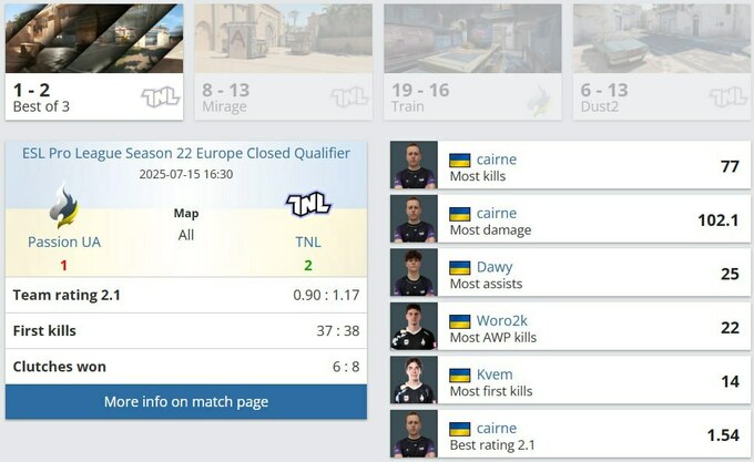 Сьогодні, 15 липня, у рамках закритої європейської кваліфікації до ESL Pro League Season 22 відбулося українське дербі – TNL зустрілись із Passion UA у матчі за вихід у півфінал верхньої сітки. Після напруженого протистояння перемогу здобула команда TNL з рахунком 2:1 (13:8 на Mirage, 16:19 на Train, 13:6 на Dust2).