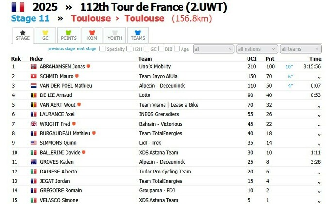 У середу, 16 липня, відбувся 11-й етап шосейного гранд-туру Tour de France 2025. Перемогу здобув представник команди Uno-X Mobility Йонас Абрахамсен.