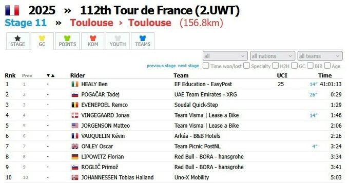 Після 11-го етапу лідером загального заліку залишається Бен Хілі. Тадей Погачар відстає на 29 секунд.