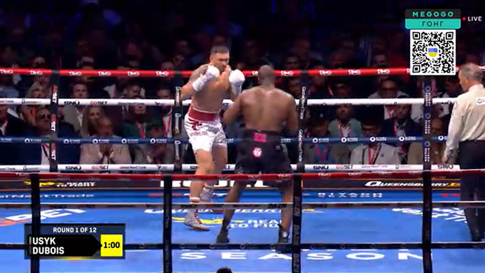 00:22. Перший раунд. Розвідка. Дюбуа пресингує, забрав контроль в центрі рингу. Відганяє лівою рукою Усика. Українець непогано рухається на ногах. Усик завдав декілька відчутних ударів, перший раунд за ним, 10–9