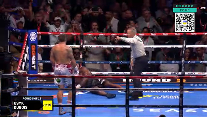 00:37. 5-й раунд! Усик влучає! Це нокдаун. І ще нокдаун! Рефері каже стоп. Перемога Усика!