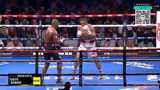 00:35. Четвертий раунд. Досить рівний бій на рингу. Дюбуа затиснув в кутку, але Усик встиг вийти звідти. Були натяки на удари нижче пояса від Дюбуа. 39–37 на користь Усика.