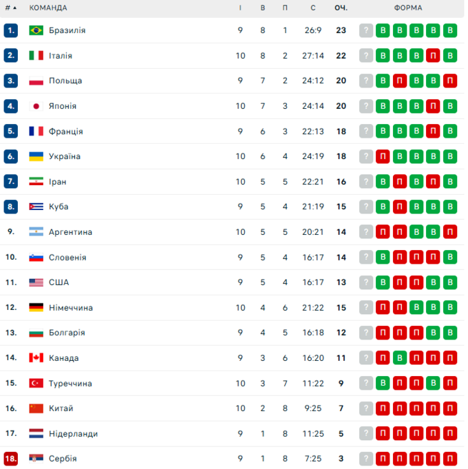 Турнірне становище Ліги націй з волейболу: Бразилія (23 очки), Італія (22 очки) Польща, Японія (20 очок), Франція, Україна (18 очок), Іран (16 очок), Куба (15 очок), Аргентина, Словенія (14 очок), США (13 очок), Німеччина (15 очок, але менше перемог), Болгарія (12 очок), Канада (11 очок), Туреччина (9 очок), Китай (7 очок), Нідерланди (5 очок), Сербія (3 очки).