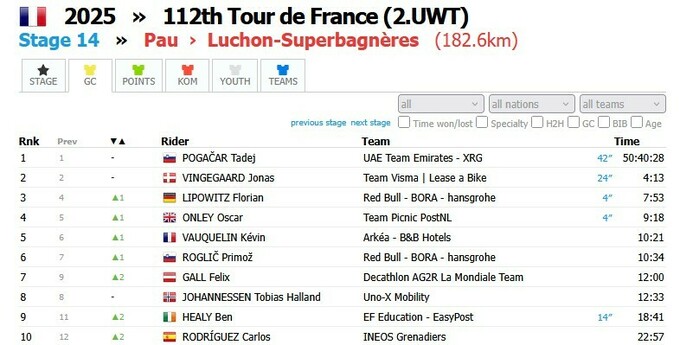 Після 14-го етапу лідером загального заліку залишається Тадей Погачар. Йонас Вінгегор відстає на 4 хвилини і 13 секунд.