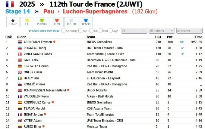 У суботу, 19 липня, відбувся 14-й етап шосейного гранд-туру Tour de France 2025. Перемогу здобув представник команди INEOS Grenadiers Таймен Аренсман.