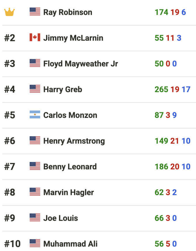 Лідером рейтингу став Шугар Рей Робінсон – легендарний американський боксер виграв на профі-рингу 174 поєдинки.