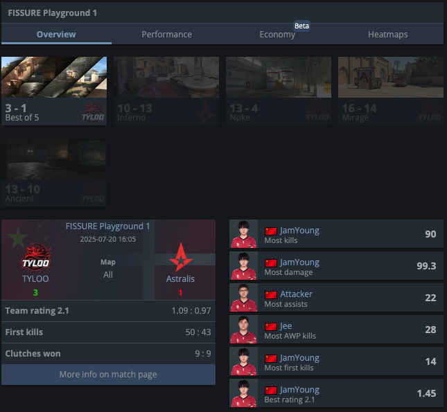 Одним з головних творців обох перемог TYLOO став Ї «JamYoung» Ян, який показав рейтинг 1.59 у груповому матчі та 1.45 у гранд-фіналі. На вирішальній стадії турніру він також набрав 99.3 ADR, 0.97 KPR і 1.76 impact-рейтингу.
