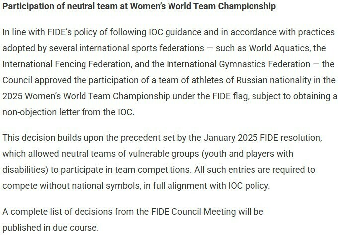 Міжнародна федерація шахів (FIDE) дозволила участь жіночої збірної росії у командному чемпіонаті світу 2025 у нейтральному статусі.