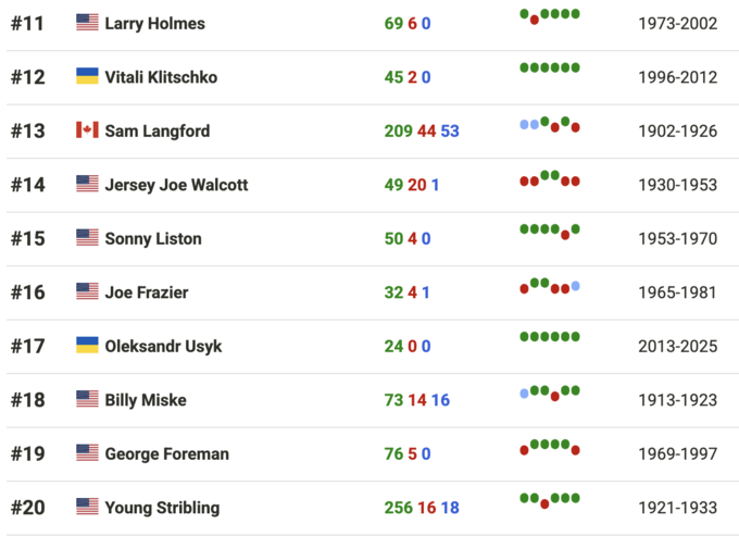 Комп'ютеризована система порталу BoxRec оновила свій рейтинг найкращих супертяжів за всю історію.