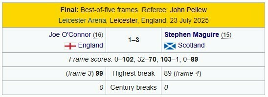 У фінальному матчі шотландець обіграв Джо О'Коннора з рахунком 3:1