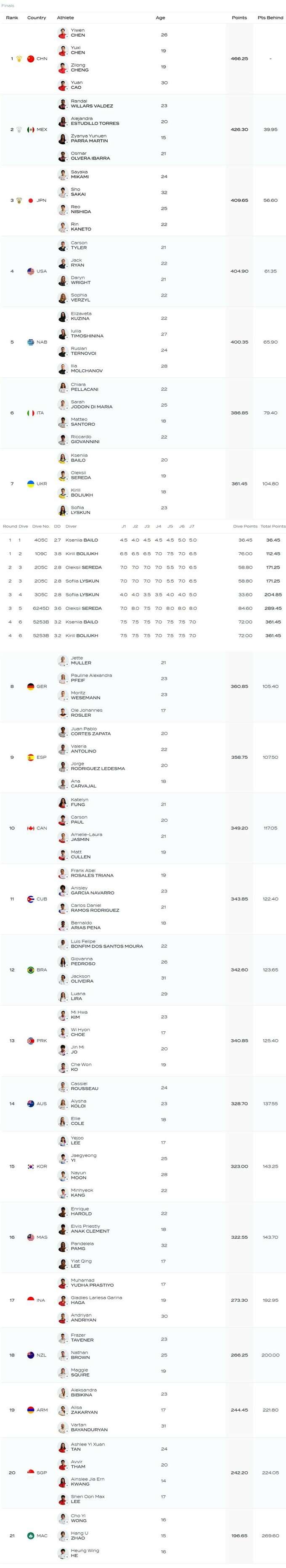 Завершальний синхрон з 10-метрової вишки у виконанні Байло і Болюха (72.00 бали) дозволив синьо-жовти завершити змагання 7-ми з загальним результатом 361.45 бали.